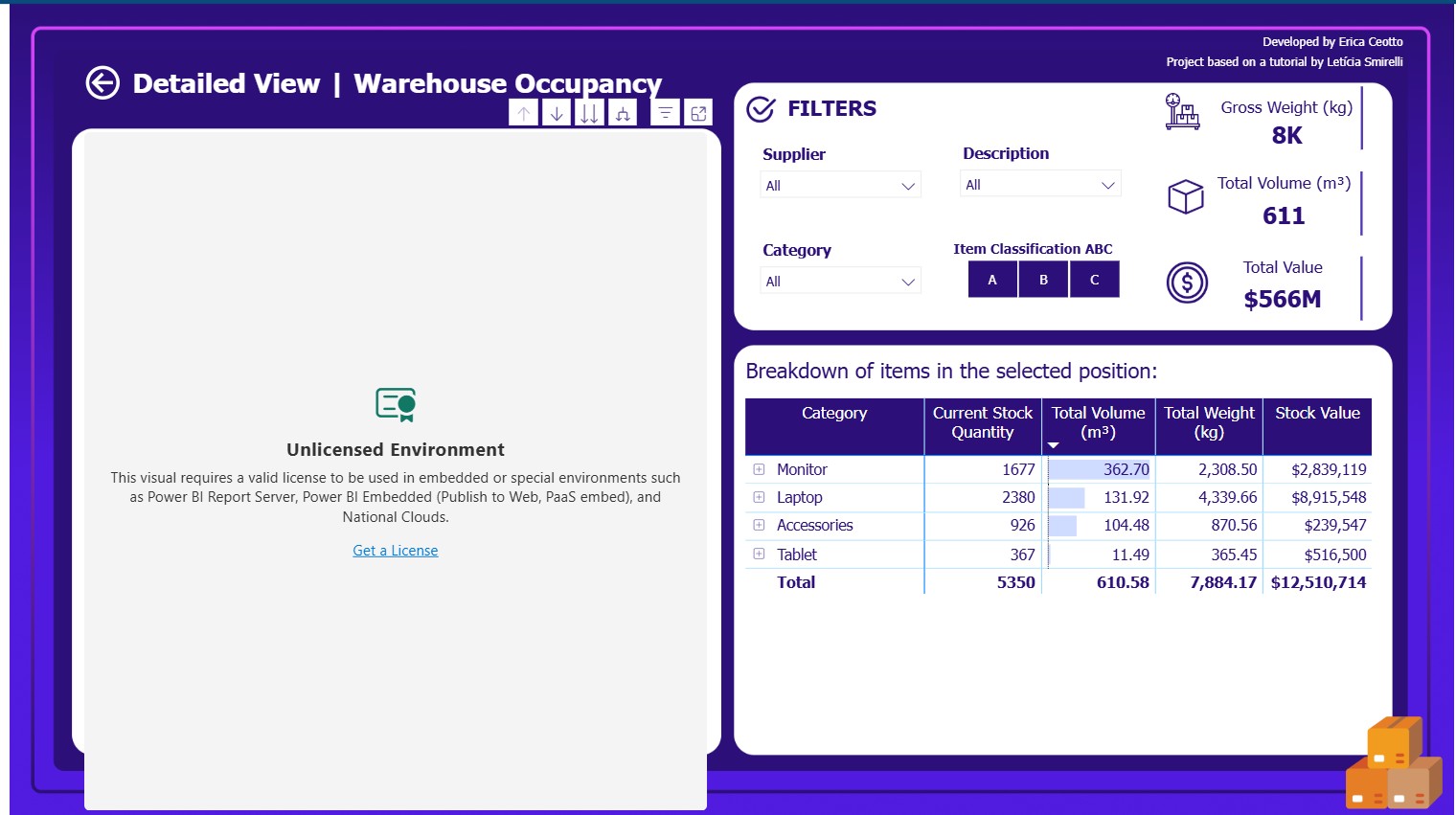 Developed a comprehensive logistics dashboard focusing on inventory management and warehouse occupancy optimization. The system tracks $566M in revenue across 34K orders with detailed supplier analysis including major technology brands (Dell, Acer, Samsung, Lenovo, Apple). Features advanced ABC classification for inventory optimization, monitors turnover rates of 45, and provides detailed warehouse floor planning through synoptic panel visualization. The dashboard enables users to explore storage areas by product type, supplier performance, item value, quantity analysis, and weight distribution for efficient warehouse operations and inventory control.