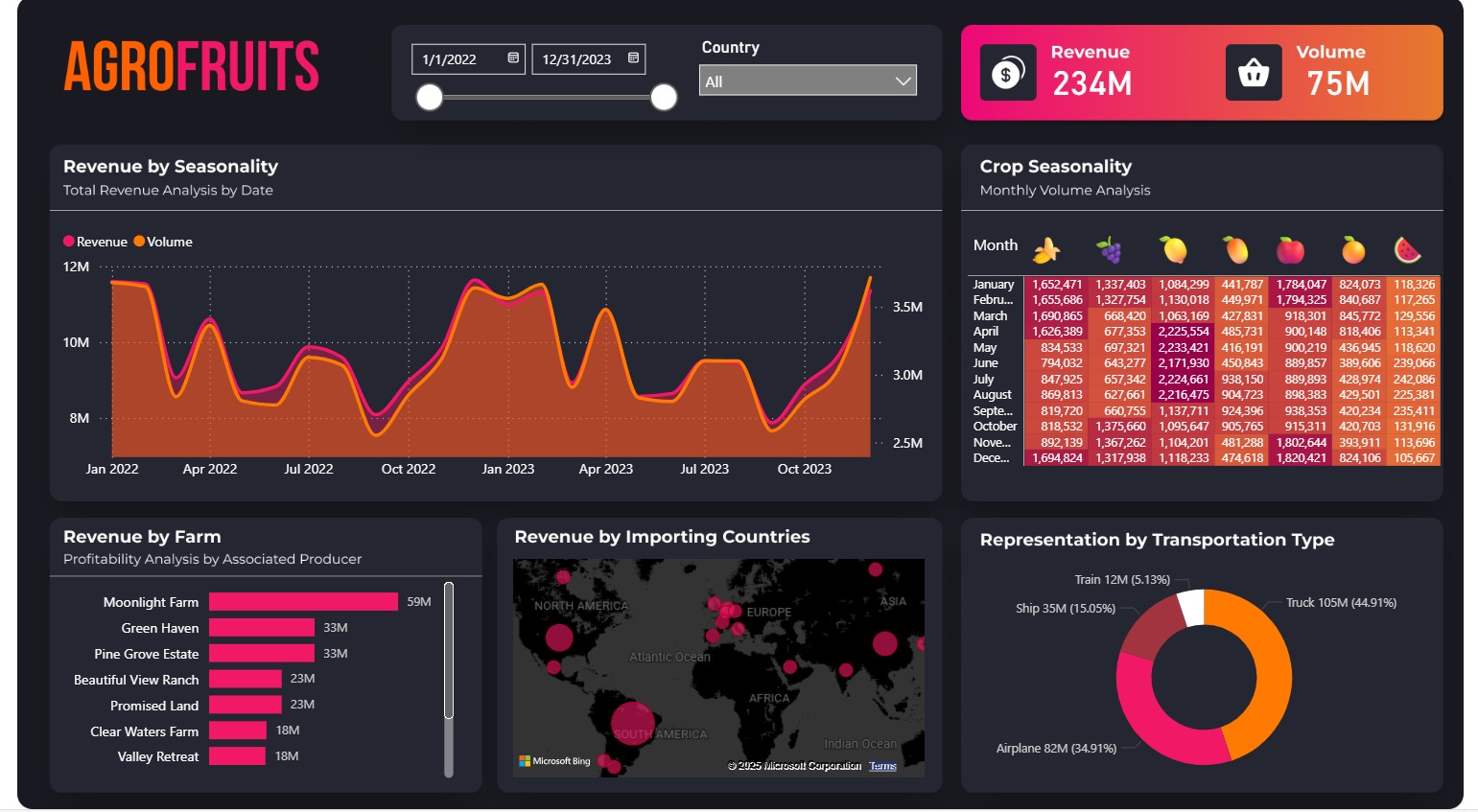 - Key Features: Revenue tracking ($234M), volume analysis (75M units), seasonal crop monitoring, multi-farm profitability analysis (Moonlight Farm $59M, Green Haven $33M), global import/export mapping, transportation optimization (Truck 44.91%, Airplane 34.91%, Ship 15.05%), monthly crop seasonality tracking with fruit-specific analytics.