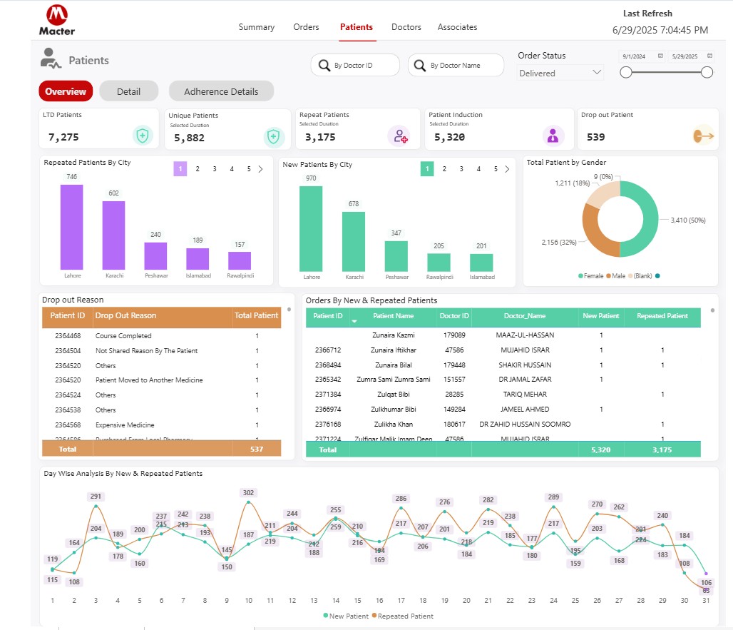Developed a comprehensive healthcare management system to monitor pharmaceutical operations and patient care delivery. The dashboard provides real-time insights into patient communication (63,000+ calls), medication orders (15,456 orders), and treatment outcomes across multiple channels. It enables healthcare providers to track patient adherence, analyze drop-out patterns, monitor doctor performance, and optimize medication delivery through integrated WhatsApp communication and detailed sales analytics by age groups and medical conditions.